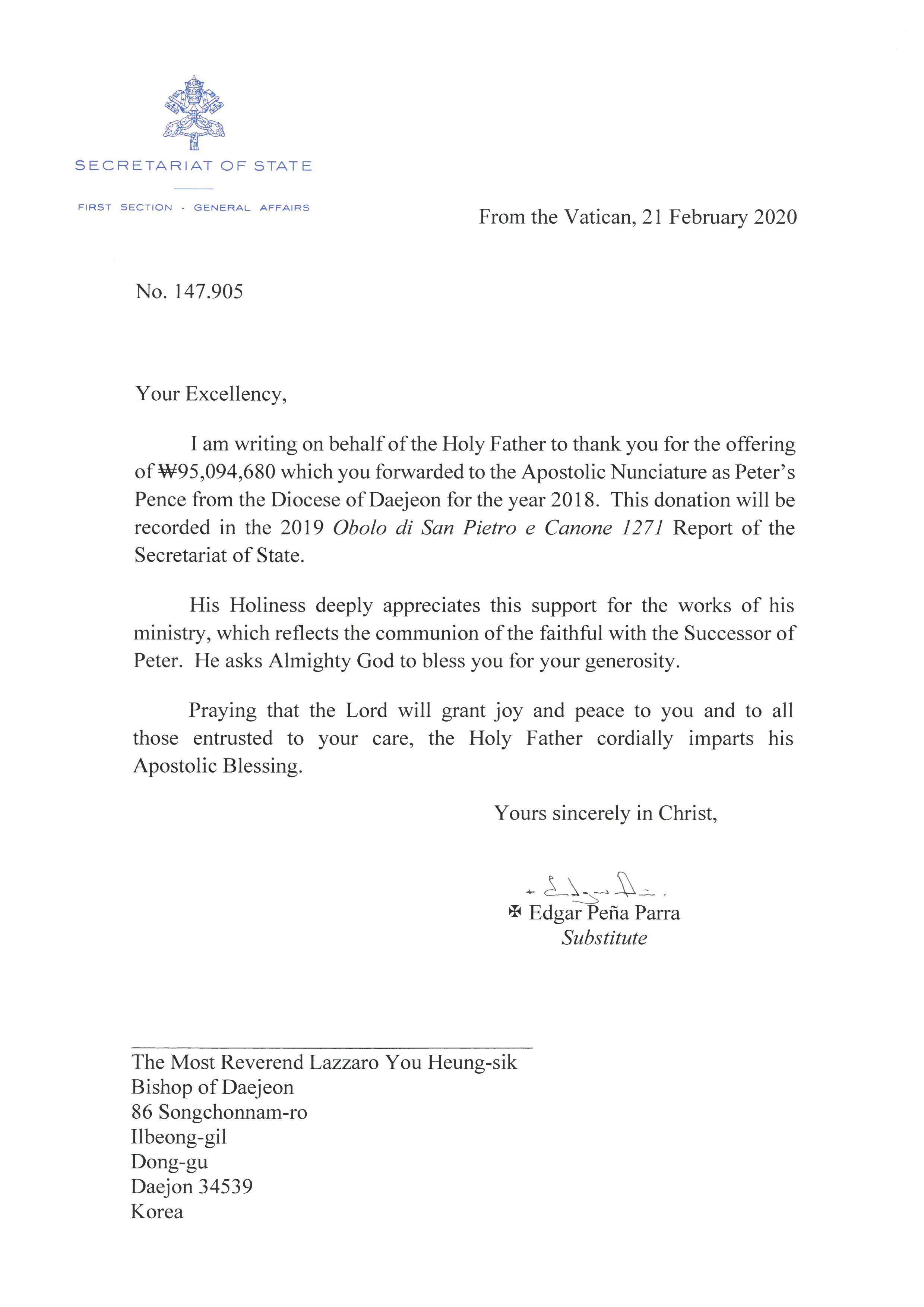 Á¦¸ñ 20200221-±³È²Ã» ±¹¹«ºÎÀå(Edgar Peña Parra) ´ëÁÖ±³´Ô ¼­ÇÑ