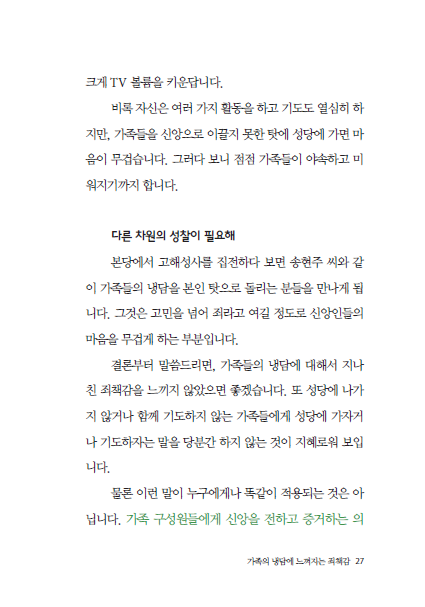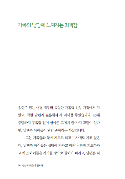 ¡®°¡Á·ÀÇ ³Ã´ãÀ» Àڽж§¹®À̶ó°í ¿©±â´Â ÁֺΡ¯, ¡®ÀÚ½ÅÀÇ È¯½Ã üÇèÀ» ¾î¶»°Ô ¹Þ¾Æµé¿©¾ß ÇÏ´ÂÁö ¹¯´Â ¿©¼º¡¯, ¡®½ÃÇè¿¡ °Åµì ³«¹æÇÑ µÚ ¼ö³à¿ø¿¡ ÀÔȸÇϰڴٴ µþ ¶§¹®¿¡ °í¹ÎÇÏ´Â ¾î¸Ó´Ï¡¯, ¡®¼º´ç ÀÏ¿¡ ºüÁ® ÀÖ´Â ¾Æ³»°¡ °¡Á¤¿¡ Ãæ½ÇÇÏ°Ô ÇÏ·Á¸é ¾î¶»°Ô ÇØ¾ß ÇÏ´ÂÁö ¹¯´Â Á߳⠳²¼º¡¯, ¡®½Å¾ÓÀÌ ¾Æ¹«·± µµ¿òÀÌ µÇÁö ¾Ê´Â °Í °°´Ù´Â û³â¡¯ µî°ú °°ÀÌ ½Å¾ÓÀÇ Á¤µµ¿¡ »ó°ü¾øÀÌ °¡Áú ¼ö ÀÖ´Â °í¹Î¿¡¼­ºÎÅÍ, ¡®°ú°ÅÀÇ ¾ÆÇ ±â¾ï ´Ù·ç±â¡¯, ¡®¸¶¸¶º¸ÀÌÀÇ È¦·Î ¼­±â¡¯, ¡®¼ú²Û ³²Æí¿¡°Ô ÁöÄ£ ¾Æ³»¡¯, ¡®È­³ª¸é À̼ºÀ» ÀÒ´Â ´ÙÇ÷Áú¡¯ µî°ú °°ÀÌ ´©±¸³ª Àϻ󿡼­ °ÞÀ» ¼ö ÀÖ´Â °í¹Î±îÁö ±× ¹°À½Àº ´Ù¾çÇÏ´Ù. ¸ðµÎ ½±»ç¸® ´Ù¸¥ À̵鿡°Ô ²¨³»³õÀ» ¼ö ¾ø°í, ±×·¸´Ù°í ½º½º·Î Ç®¾î³»±â¿¡ ½±Áö ¾ÊÀº ¹®Á¦µéÀÌ´Ù. ÀúÀÚ´Â ¿ì¸®°¡ ±³È¸ ¾ÈÆÆ¿¡¼­ ºÎµúÈ÷°Ô µÇ´Â ´Ù¾çÇÑ ¹®Á¦µéÀ» ÀÏ»ó°ú ½Å¾Ó»ýȰÀÇ ÀÔüÀûÀ̰í ÅëÇÕÀûÀÎ ½Ã°¢À» ÅëÇØ ¹®Á¦¿¡ ´Ù°¡°¡°í ¸¶ÁÖÇÒ ¼ö ÀÖµµ·Ï À̲ø¾î ÁØ´Ù.