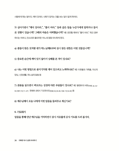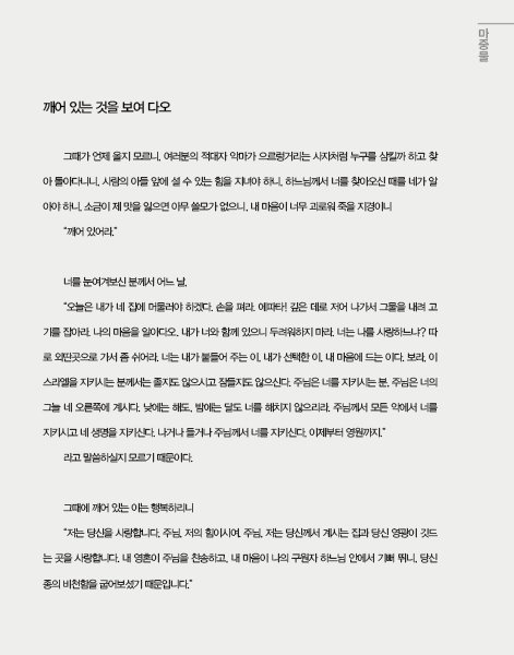 ¼º°æÀÇ ¸»¾¸À» µè´Â µ¶¼´Â ³»¸éÀÇ ¸»¾¸À» µè±â À§ÇÑ ³ë·ÂÀÎ ¡®¹¬»ó¡¯À¸·Î À̾îÁø´Ù. µ¶¼¿Í ¹¬»óÀ¸·Î ä¿öÁø ¿ì¸®ÀÇ ¸¶À½À¸·Î ±×ºÐ²² ÀÀ´äÇÏ´Â ¡®±âµµ¡¯´Â ÇÏ´À´ÔÀÇ ½Å·Ú¿¡ ´ëÇÑ ÀÚ¿¬½º·´°í ¼ÖÁ÷ÇÑ ´ë´äÀÌ´Ù. ¸¶Áö¸· ´Ü°èÀÎ ¡®°ü»ó¡¯Àº ¸ðµç ¼¼»óÀ» ÇÏ´À´ÔÀÇ ´«À¸·Î ¹Ù¶óº¸´Â °Í°ú °°Àº ³ÐÀº ¸¶À½À» ±¸Çϸç, ¿ì¸® Á¤½Å°ú ¸¶À½ÀÇ ÁøÁ¤ÇÑ È¸°³¸¦ À̲ø¾î ³»´Â °úÁ¤ÀÌ´Ù.