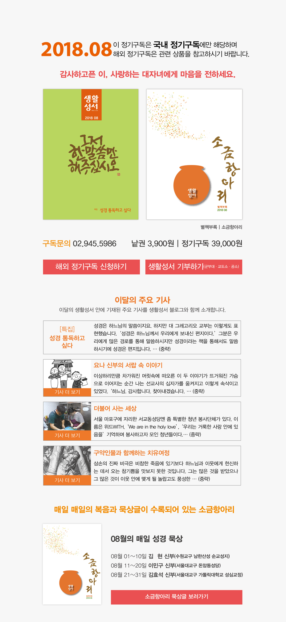 2018³â »ýȰ¼º¼­ 8¿ùÈ£°¡ ¿©·¯ºÐÀÇ ¼º°æÅëµ¶À» µµ¿Íµå¸± ¼ö ÀÖ½À´Ï´Ù!!  [±¸µ¶Çϱâ]