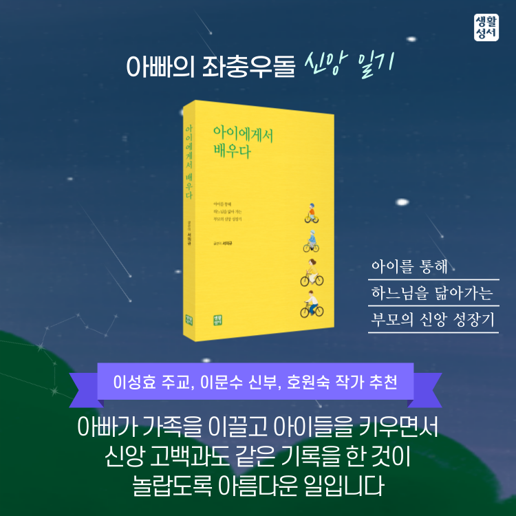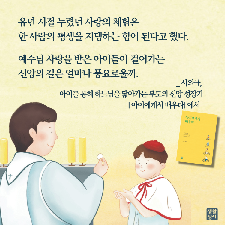 ¡º¾ÆÀÌ¿¡°Ô¼ ¹è¿ì´Ù¡»´Â ÀúÀÚ°¡ µÎ ¾ÆÀ̸¦ Ű¿ì´Â °úÁ¤ Áß Å«¾ÆÀ̰¡ ù¿µ¼ºÃ¼¸¦ ÇÏ°Ô µÉ ¹«·ÆºÎÅÍ ½ÃÀÛÇÏ¿© ÀÛÀº¾ÆÀ̰¡ ´Ù½Ã ù¿µ¼ºÃ¼¸¦ ¾ÕµÐ ½Ã±â±îÁö 4³â µ¿¾ÈÀÇ °¡Á· À̾߱â´Ù. ù¿µ¼ºÃ¼´Â Àڳడ º»°ÝÀûÀ¸·Î ÇÏ´À´ÔÀ» ¸¸³ª°í ±×ºÐÀ» ¸ð½Ã´Â Áß¿äÇÑ ½Ã±âÀ̱⿡, °¡Á·ÀÌ ´ÙÇÔ²² ù¿µ¼ºÃ¼¸¦ ÁغñÇϰí ÇÏ´À´ÔÀ» ¸ð½Ã´Â °úÁ¤ÀÌ »ý»ýÇÏ°Ô ÀüÇØÁø´Ù. ¾ÆÀÌ¿Í ÇÔ²² ÆòÀÏ ¹Ì»ç¿¡ Âü¿©ÇÏ°í ¼º°æ ¾²±â¸¦ ÇÔ²²ÇÏ´Â ¾Æºü, ¾ÆÀ̰¡ ¿Ü¿ö¾ß ÇÒ ±âµµ¹®À» ¹ø°¥¾Æ ÇÔ²² ¿Ü¿ö ÁÖ´Â ¾ö¸¶, Çü¾ÆÀÇ Àü·Ê Âü¿©¸¦ ºÎ·¯¿î ´«À¸·Î ¹Ù¶óº¸´Â ¸·³». ¸¶Áö¸· °ü¹® ù¿µ¼ºÃ¼ Âû°í¸¦ ¾ÕµÎ°í ´ç»çÀÚÀÎ ¾ÆÀ̺¸´Ù ´õ ¶³·È´ø Ãʺ¸ ºÎ¸ðÀÇ ¸¶À½ÀÌ ¼¶¼¼ÇÏ°Ô ÀüÇØÁø´Ù. ÀÌ·± ÀÏ·ÃÀÇ °úÁ¤À» ÅëÇØ ºÎ¸ð´Â ½Å¾Ó Ȱµ¿°ú ½Å¾Ó ±³À°¿¡µµ ´õ ¸¹Àº ¿ÀǸ¦ º¸ÀÌ°Ô µÇ¾ú´Ü´Ù. ¡º¾ÆÀÌ¿¡°Ô¼ ¹è¿ì´Ù¡»¿¡´Â ÀÌ·¯ÇÑ ÀÚ³àÀÇ ½Å¾Ó ±³À°¿¡ ´ëÇÑ °í¹Î°ú ¹¬»óµéÀÌ Áø¼ÖÇÏ°Ô ´ã°Ü ÀÖ´Ù.
