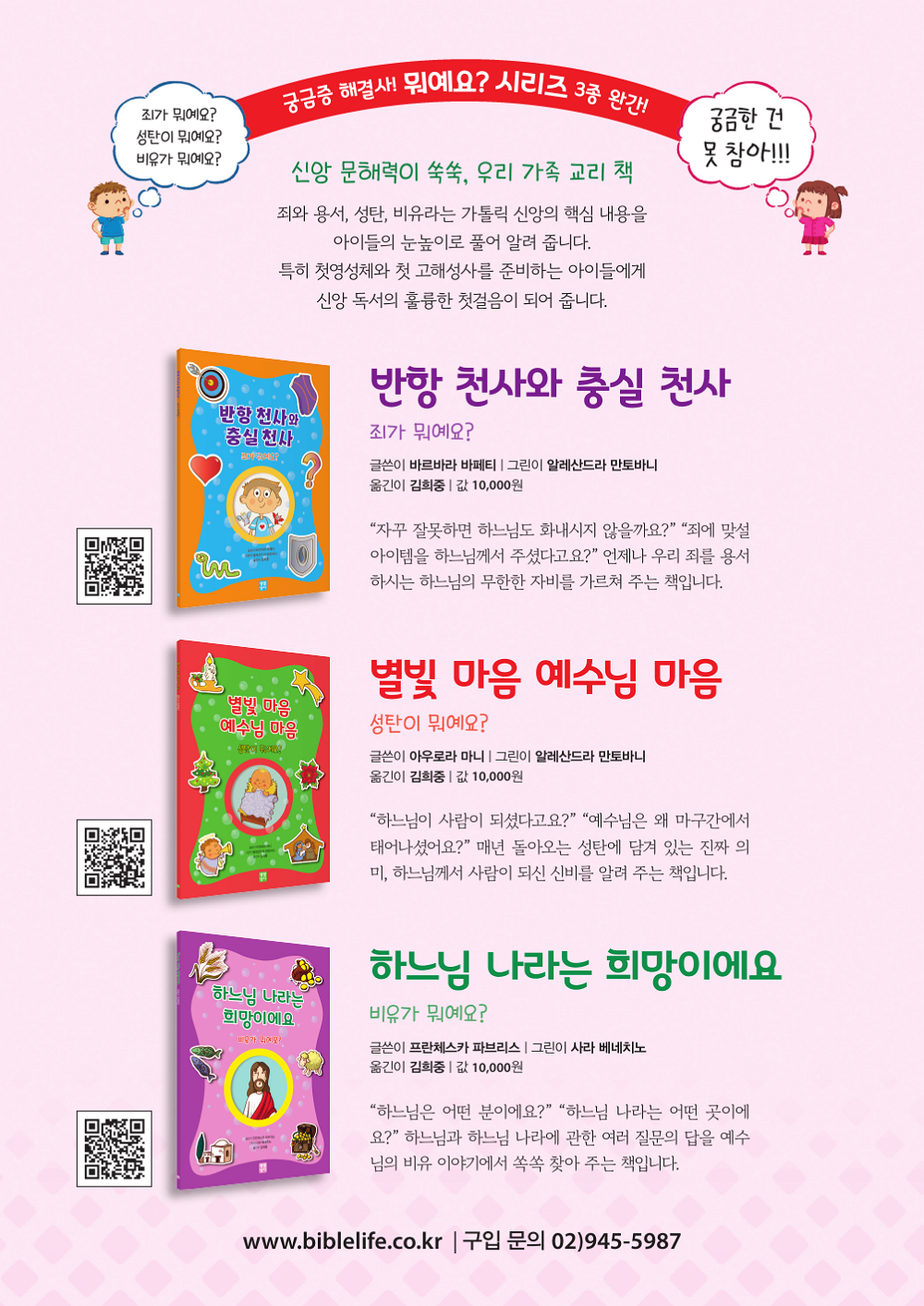 ¿ì¸® ¾ÆÀ̸¦ À§ÇÑ »ýȰ¼º¼»çÀÇ °¡Å縯 ±³¸® ÀÔ¹®¼ ¡°¹¹¿¹¿ä?¡± ½Ã¸®Áî°¡ ¿Ï°£µÇ¾ú´Ù. ¡º¹ÝÇ× Ãµ»ç¿Í Ãæ½Ç õ»ç: Á˰¡ ¹¹¿¹¿ä?¡», ¡ºº°ºû ¸¶À½ ¿¹¼ö´Ô ¸¶À½: ¼ºÅºÀÌ ¹¹¿¹¿ä?¡», ¡ºÇÏ´À´Ô ³ª¶ó´Â Èñ¸ÁÀÌ¿¡¿ä: ºñÀ¯°¡ ¹¹¿¹¿ä?¡» ÃÑ 3Á¾ÀÌ´Ù. Àü ±¤ÁÖ´ë±³±¸Àå ±èÈñÁß È÷Áö³ë ´ëÁÖ±³°¡ ¾ö¼±ÇØ ¿ì¸®¸»·Î ¿Å±ä ÀÌ ½Ã¸®Áî´Â º»°ÝÀûÀÎ ¿ì¸® ¾ÆÀÌ ½Å¾Ó µ¶¼ ±³À°¿¡ ¾Õ¼ ½Å¾Ó µµ¼¿Í Ä£¼÷ÇØÁö´Â °è´ÜÀ¸·Î¼ ¾È¼º¸ÂÃãÀÌ´Ù.