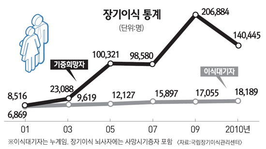 KONOS¿¡ µû¸£¸é »ì¾Æ ÀÖ´Â »ç¶÷ÀÌ ½ÅÀåÀ̳ª °£Àå∙°ñ¼ö µîÀ» À̽ÄÇØÁØ °æ¿ì´Â 2002³â ÀÌÈÄ ¸Å³â 1,600°Ç ¾ÈÆÆÀÌ´Ù. 2009³â¿¡ 1,839°ÇÀ¸·Î ´Ù¼Ò Áõ°¡ÇßÀ¸³ª Áö³ÇØ ´Ù½Ã 1,573°ÇÀ¸·Î Æò³â ¼öÁØÀ¸·Î µ¹¾Æ°¬´Ù. Àå±â¸¦ À̽ÄÇØÁØ ³ú»çÀÚµµ 2008³â 256¸í, 2009³â 261¸í, 2010³â 268¸í¿¡ ºÒ°úÇÏ´Ù. »ç¸Á ´ç½Ã¿¡ ±âÁõÇÑ »ç¶÷ÀÇ ¼öµµ 2007³âºÎÅÍ Áö³ÇرîÁö 4~8¸í ¼öÁØÀÌ´Ù.